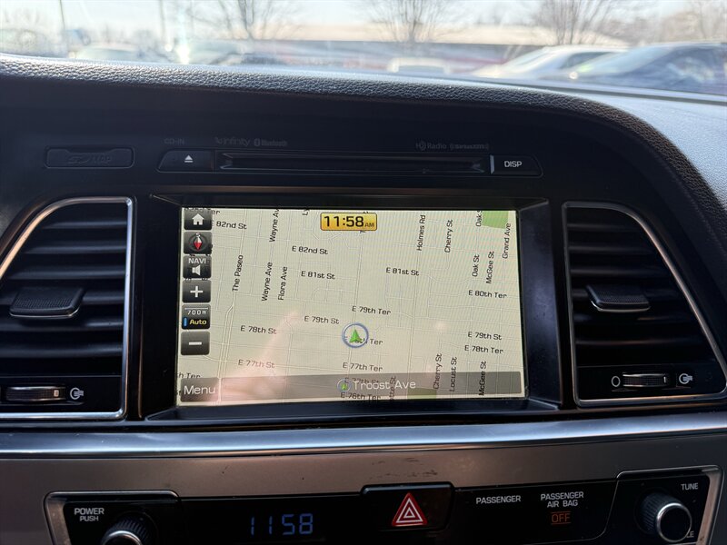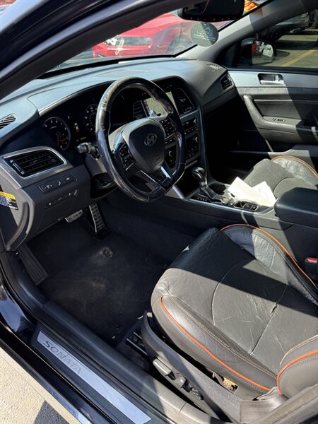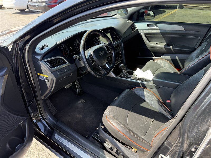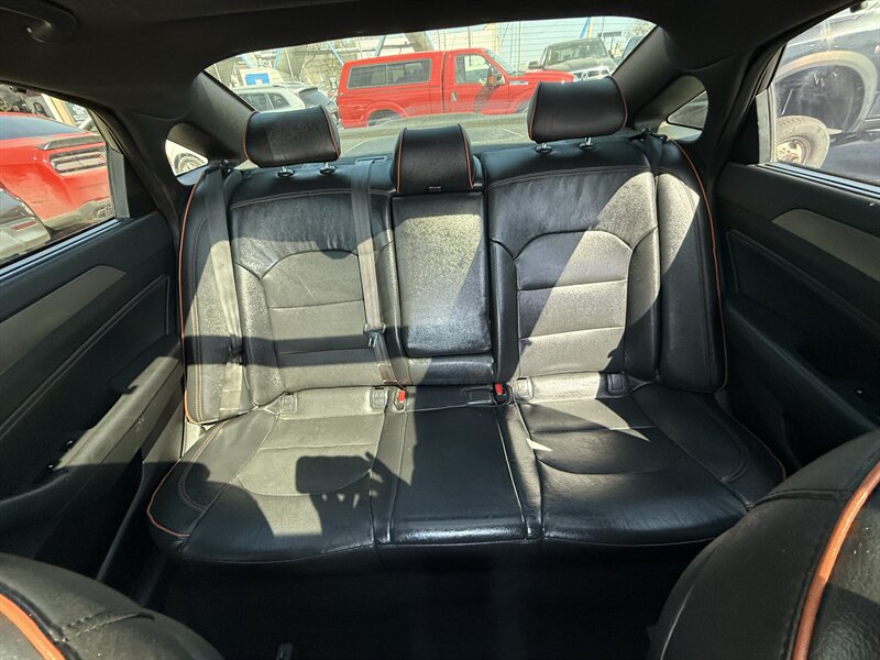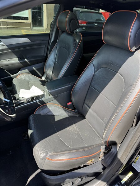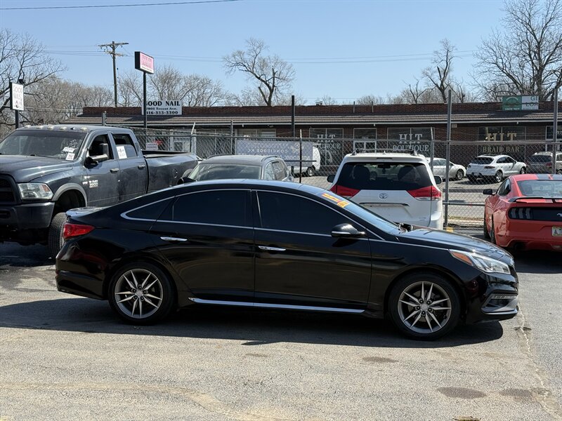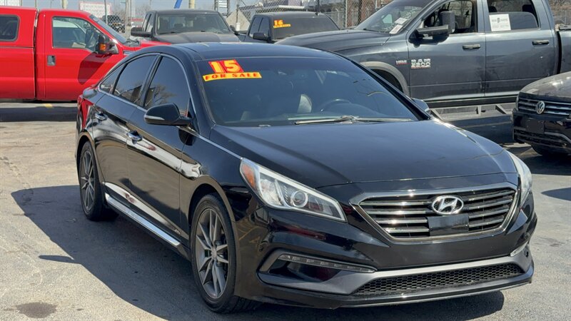 2015 Hyundai Sonata Sport 2.0T — Black exterior with Black leather interior, powered by the Theta II 2.0L Turbo I4 producing 245 hp and 260 ft-lbs. Factory-equipped for spirited daily driving with a sport-tuned suspension, dual chrome exhaust tips, 18-inch alloy wheels, and the 6-speed automatic with manual shift mode. Comfort and convenience features include leather seating surfaces, power-adjustable driver’s seat, split-folding rear seat, steering-wheel audio and cruise controls, Bluetooth hands-free/audio, USB/AUX inputs and an AM/FM audio system. Safety and electronics were factory-standard with ABS, stability and traction control, multiple airbags, tire pressure monitoring and rear visibility aids. Excellent overall condition, good mileage at under 119,000 miles (averaging <10,000/yr), and fuel economy about 23 MPG city / 32 MPG highway. Friendly, ready-to-drive Sport performance with practical everyday efficiency.