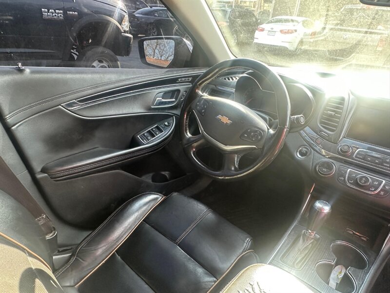 Bright, roomy and refined — this 2017 Chevrolet Impala Premier is powered by a 3.6L Flex Fuel V6 delivering 305 hp and 264 lb-ft of torque. Factory Premier appointments include leather-appointed seating, heated front seats and a heated leather-wrapped steering wheel, power-adjustable driver’s seat with memory, dual-zone automatic climate control, keyless entry with push-button start and remote start, an intuitive touchscreen infotainment system with Bluetooth and USB inputs plus steering-wheel audio controls, a rearview camera and comprehensive safety tech like blind-spot monitoring and rear cross-traffic alert, plus polished alloy wheels and chrome exterior accents. This vehicle is in excellent overall condition and comes with a clean CARFAX — ready to smile on every drive!