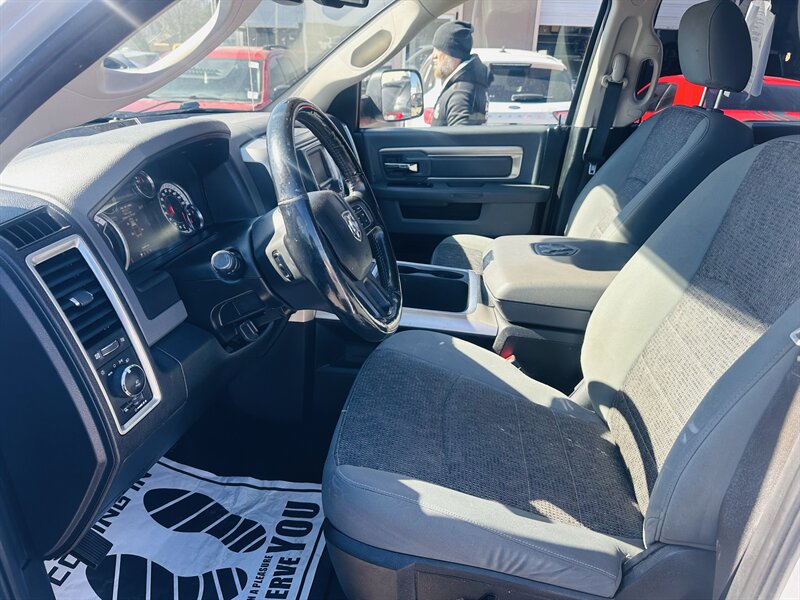 Meet the 2018 RAM 1500 Big Horn — Bright White Clear Coat outside, Black/Diesel Gray inside, powered by a HEMI 5.7L V8 with 395 hp and 410 lb-ft of torque (15 MPG city / 21 MPG highway). Factory-equipped with the essentials: rugged cloth/vinyl seats with a 60/40 split-fold rear, power windows and locks, remote keyless entry, cruise control, air conditioning, tilt/telescoping steering wheel with audio controls, Uconnect infotainment with Bluetooth and USB/AUX, durable chrome exterior trim, and a full suite of safety features including ABS, electronic stability control, multiple airbags and tire pressure monitoring. This truck is in excellent overall condition — bold, capable, and ready to make a statement.